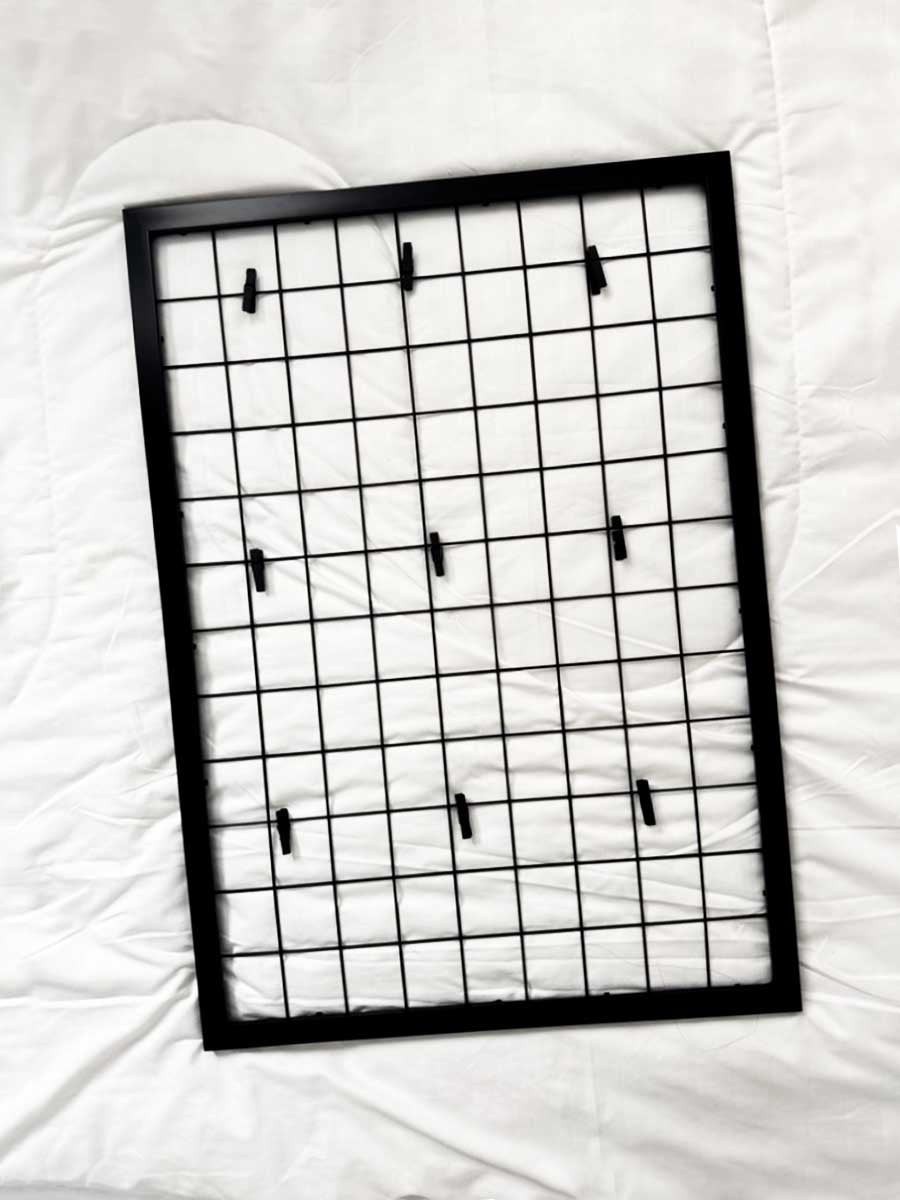 Un cadre grand format en métal pour rassembler un maximum de souvenirs en un seul regard. Sa structure grillagée permet d’exposer jusqu’à 9 photos, offrant une grande liberté de composition et faisant de ce cadre une véritable pièce déco forte.
