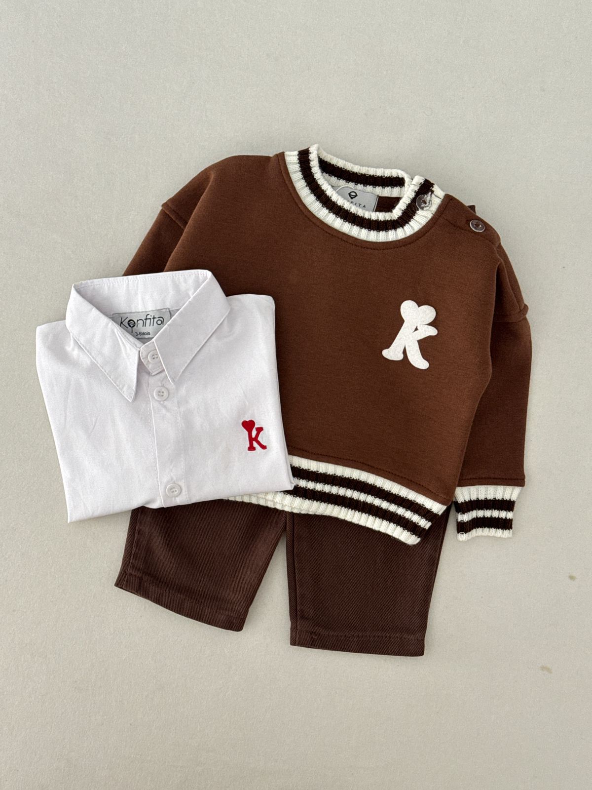 Un trio chaud et réconfortant pour habiller votre petit avec style et élégance ! Ce pack réunit trois pièces Konfita soigneusement assorties dans une palette chocolatée à tomber. Le marron profond et chaleureux du pull et du pantalon contraste à merveille avec le blanc immaculé de la chemise, pour un look coordonné et sophistiqué. ☕🍫