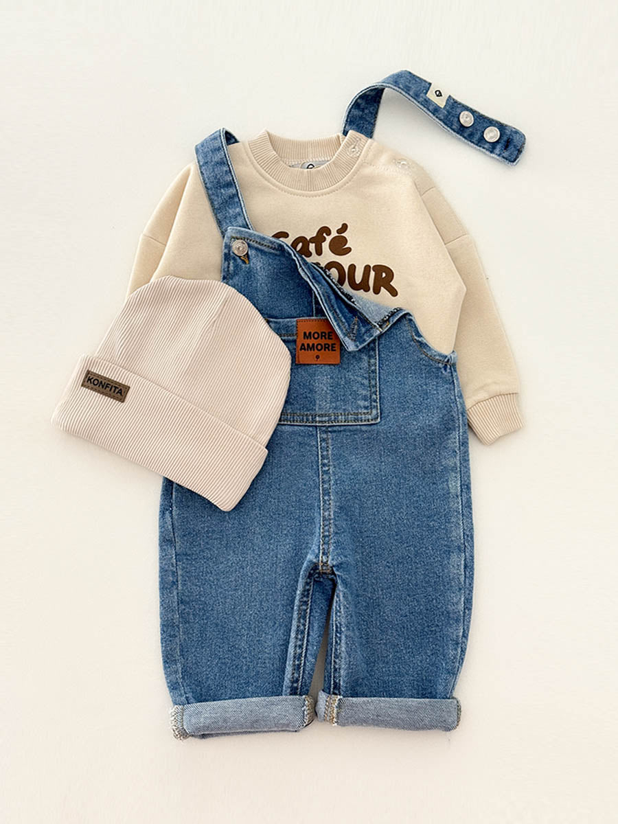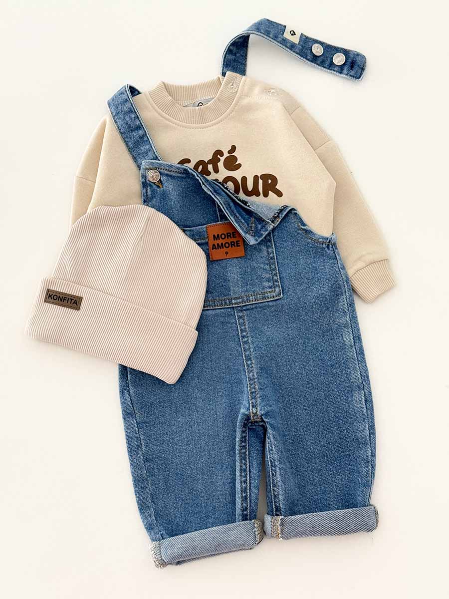 Salopette Jeans Claire More Amore : moderne et intemporelle, elle apporte une touche casual chic avec sa coupe confortable et son denim doux, idéal pour laisser bébé libre de ses mouvements.